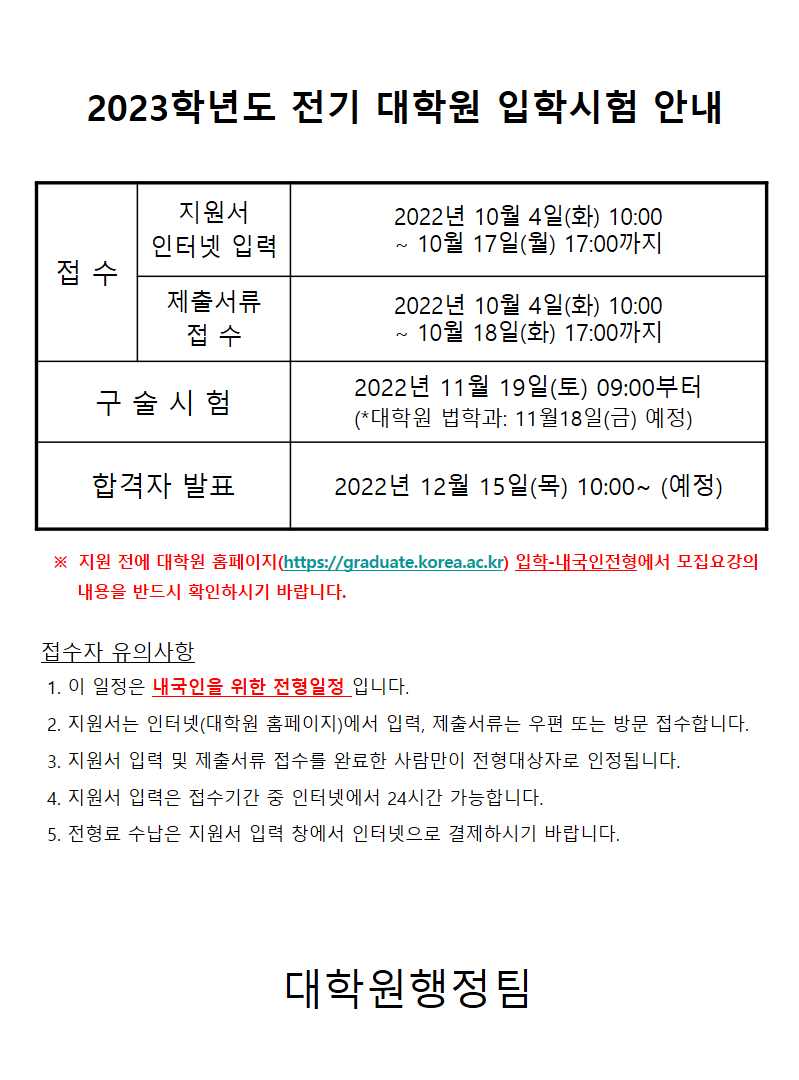 | 제목 | 2023학년도 후기 대학원 입학시험 안내 |