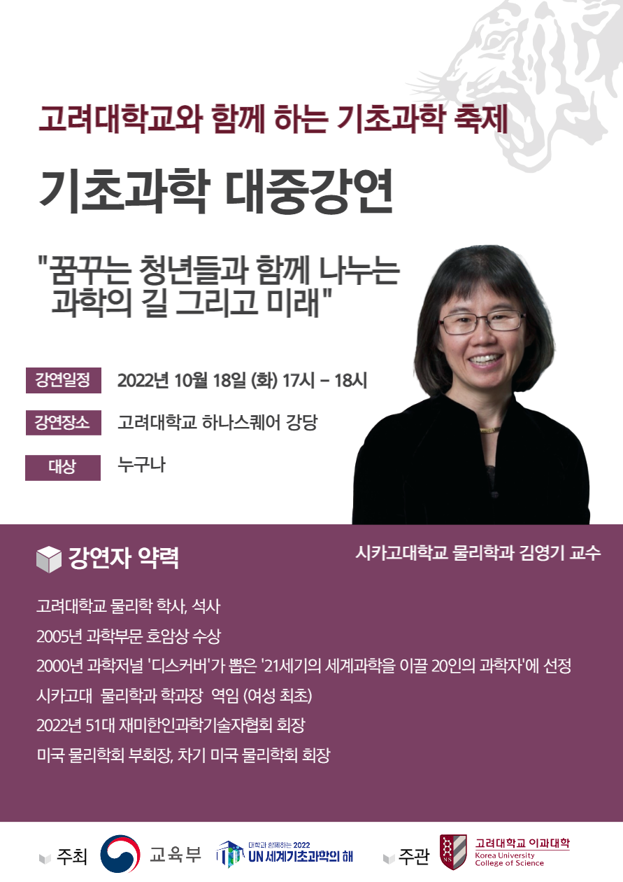 제목 고려대학교 기초과학 대중강연 안내(시카고대학교 물리학과 김영기 교수)