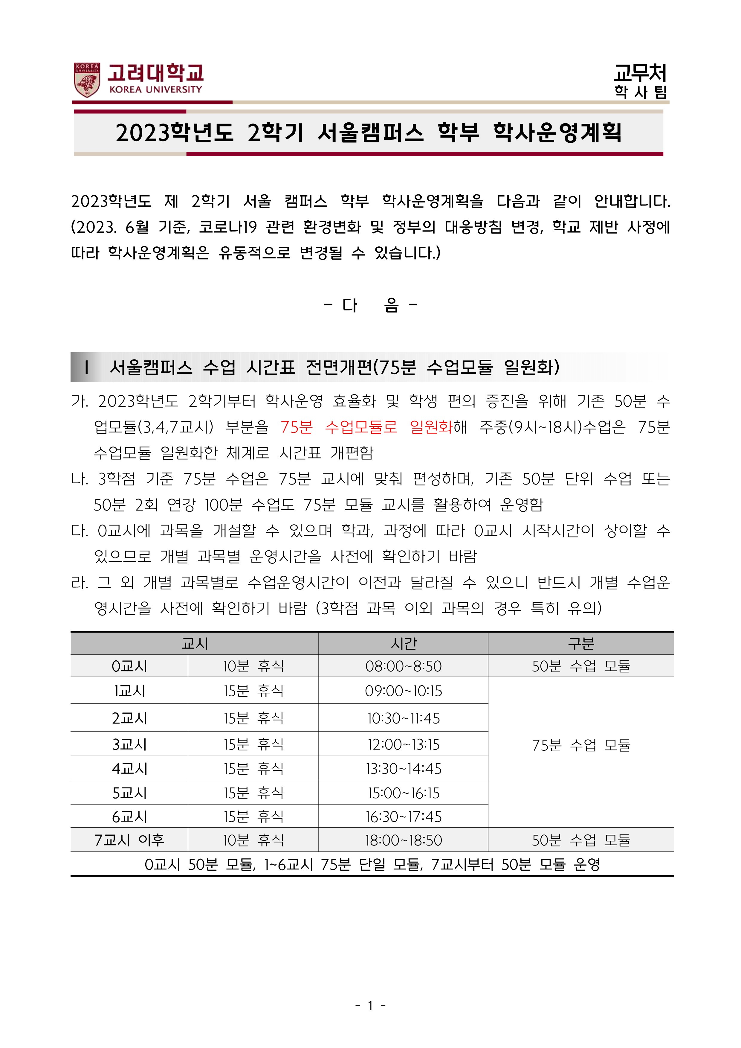 제목 2023학년도 2학기 서울캠퍼스 학부 학사운영계획