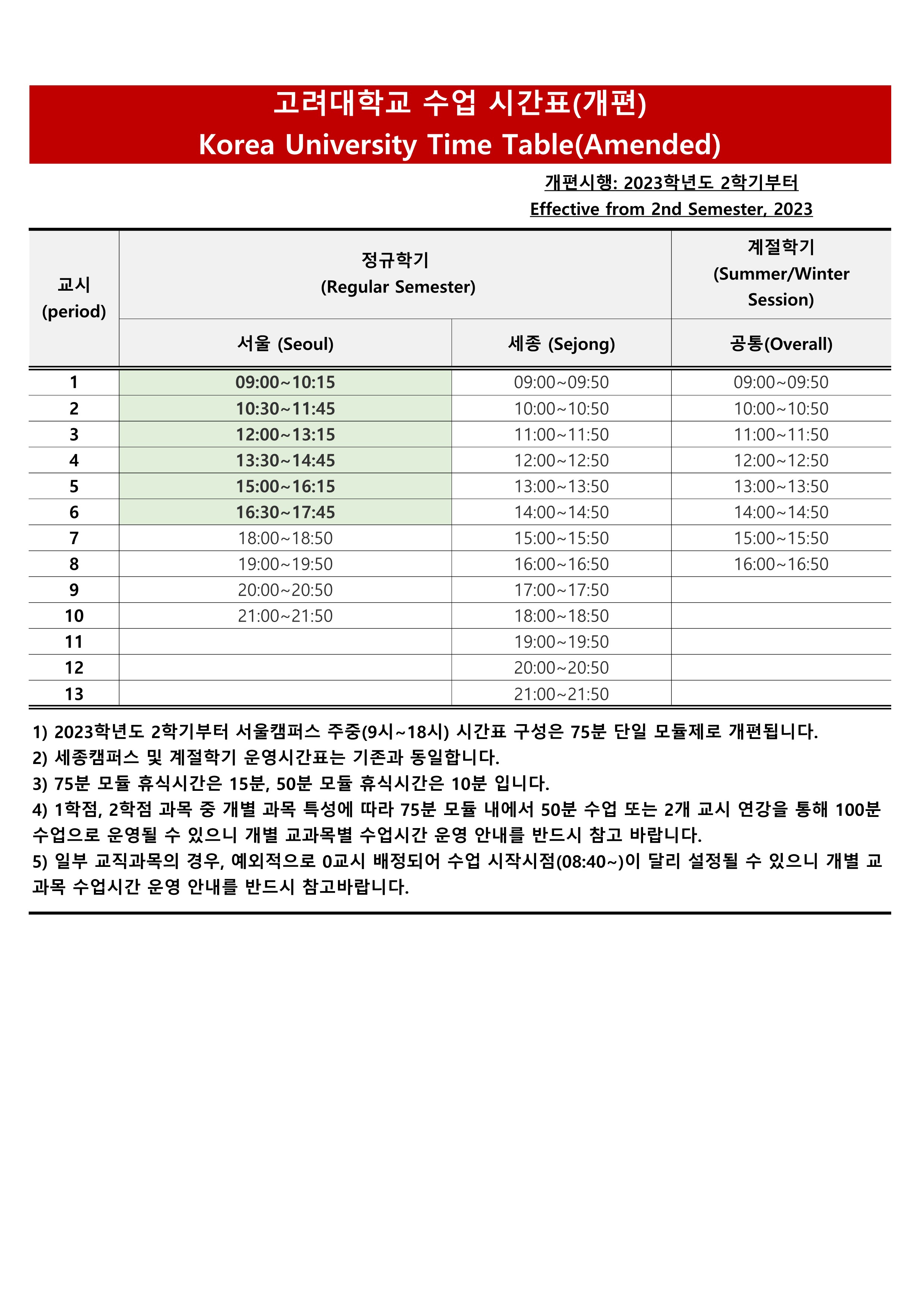 제목 2023학년도 2학기 이후 서울캠퍼스 주중 개편 시간표