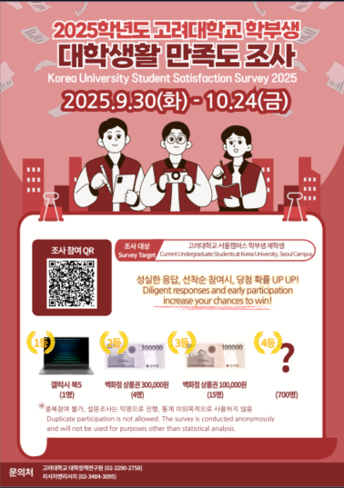 | 제목 | 2025년 고려대학교 대학생활 만족도 조사 시행 안내 |
