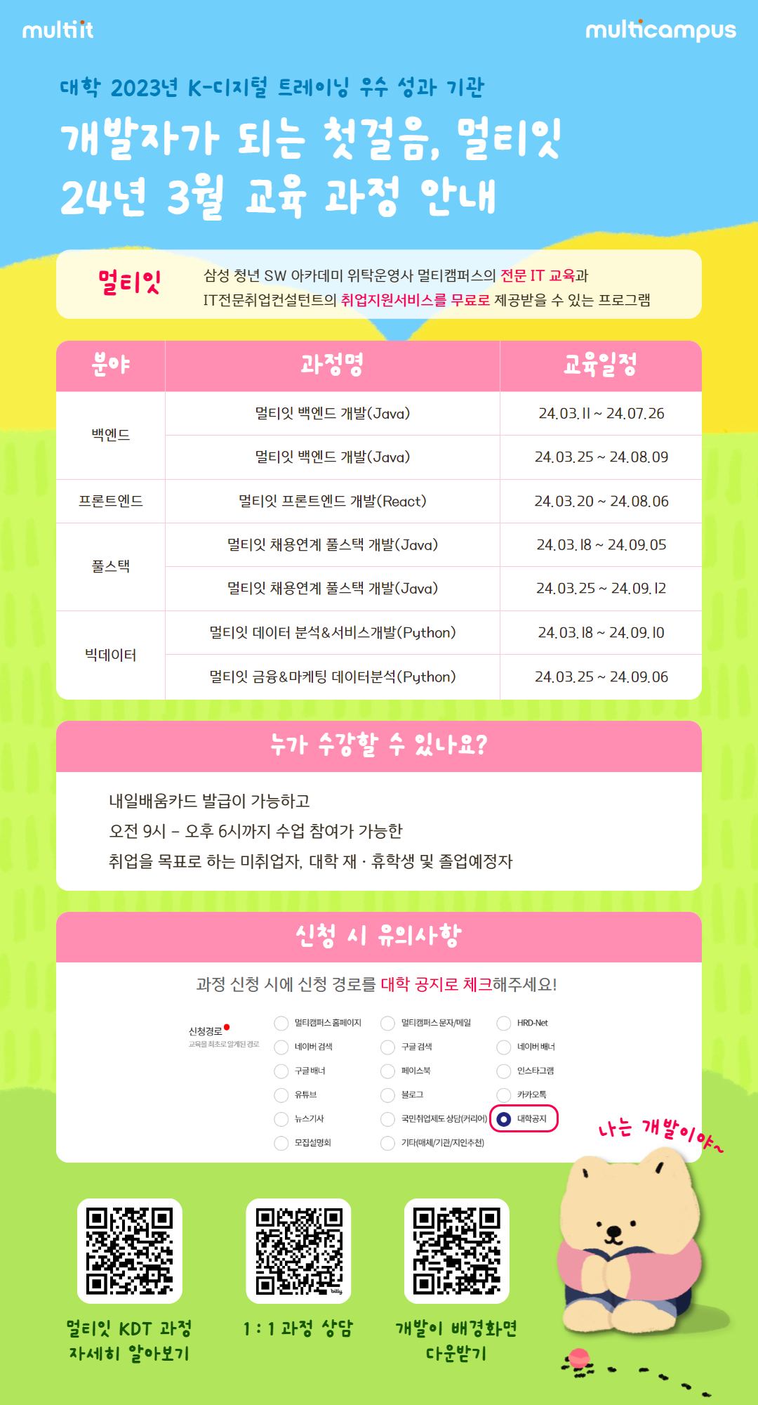 제목 [멀티캠퍼스] SW분야 개발자 양성 및 취업률 제고를 위한 KDT(K-Digital Training) 과정