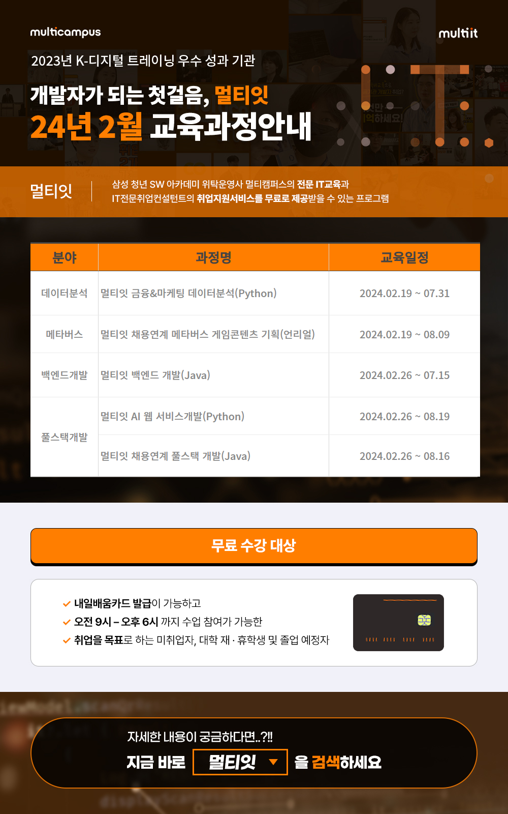[삼성 멀티캠퍼스] 24년 2월 IT취업지원교육 일정안내(K-디지털트레이닝) 상세