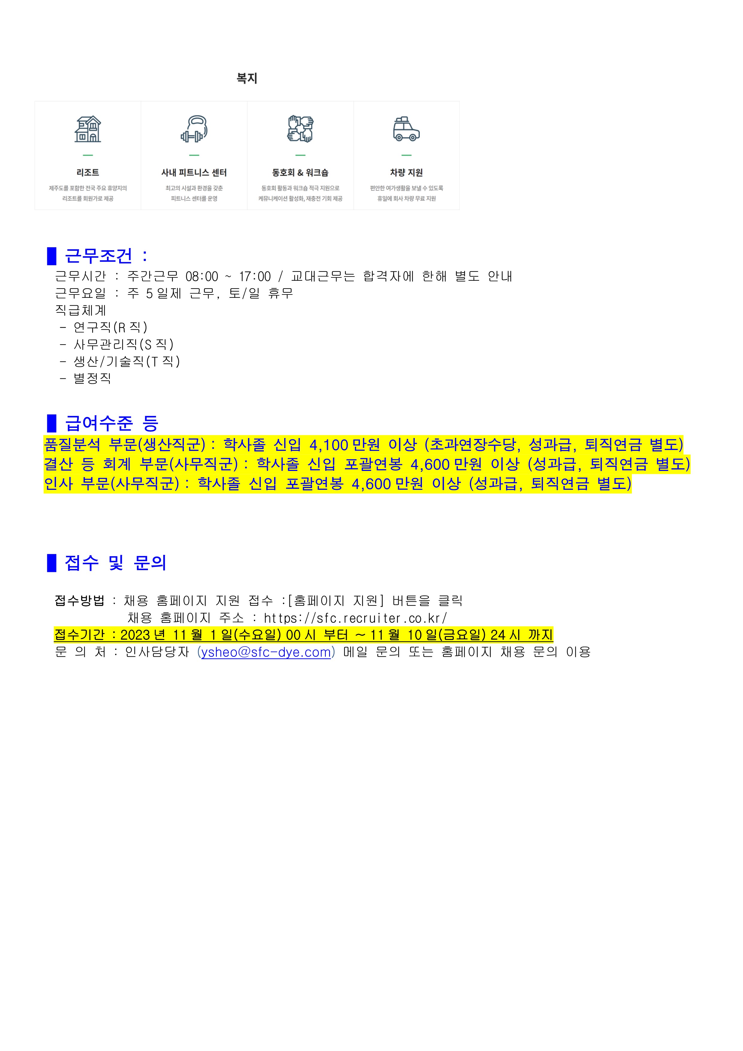 에스에프씨 23년 11월 채용 홍보(품질분석, 회계, 인사) 상세