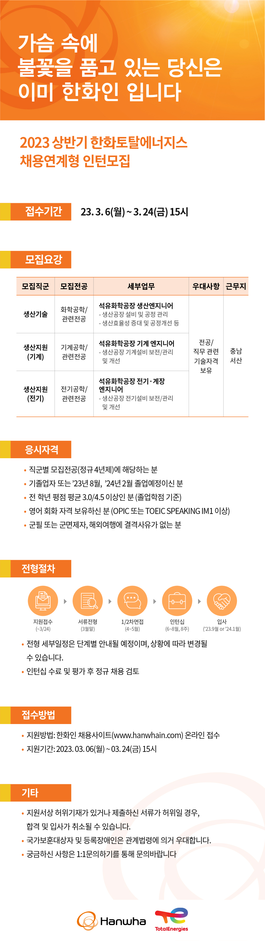 - 지원방법 : 한화인 채용사이트(www.hanwhain.com )온라인 접수