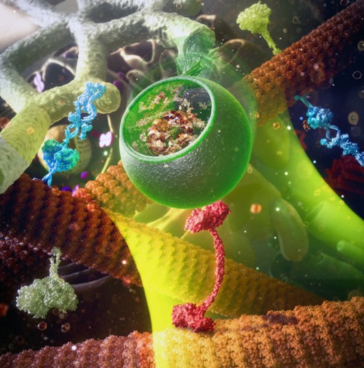 소포체-미세소관 접합점에서 자가포식체가 전이되는 순간을 나타낸 예술적 이미지